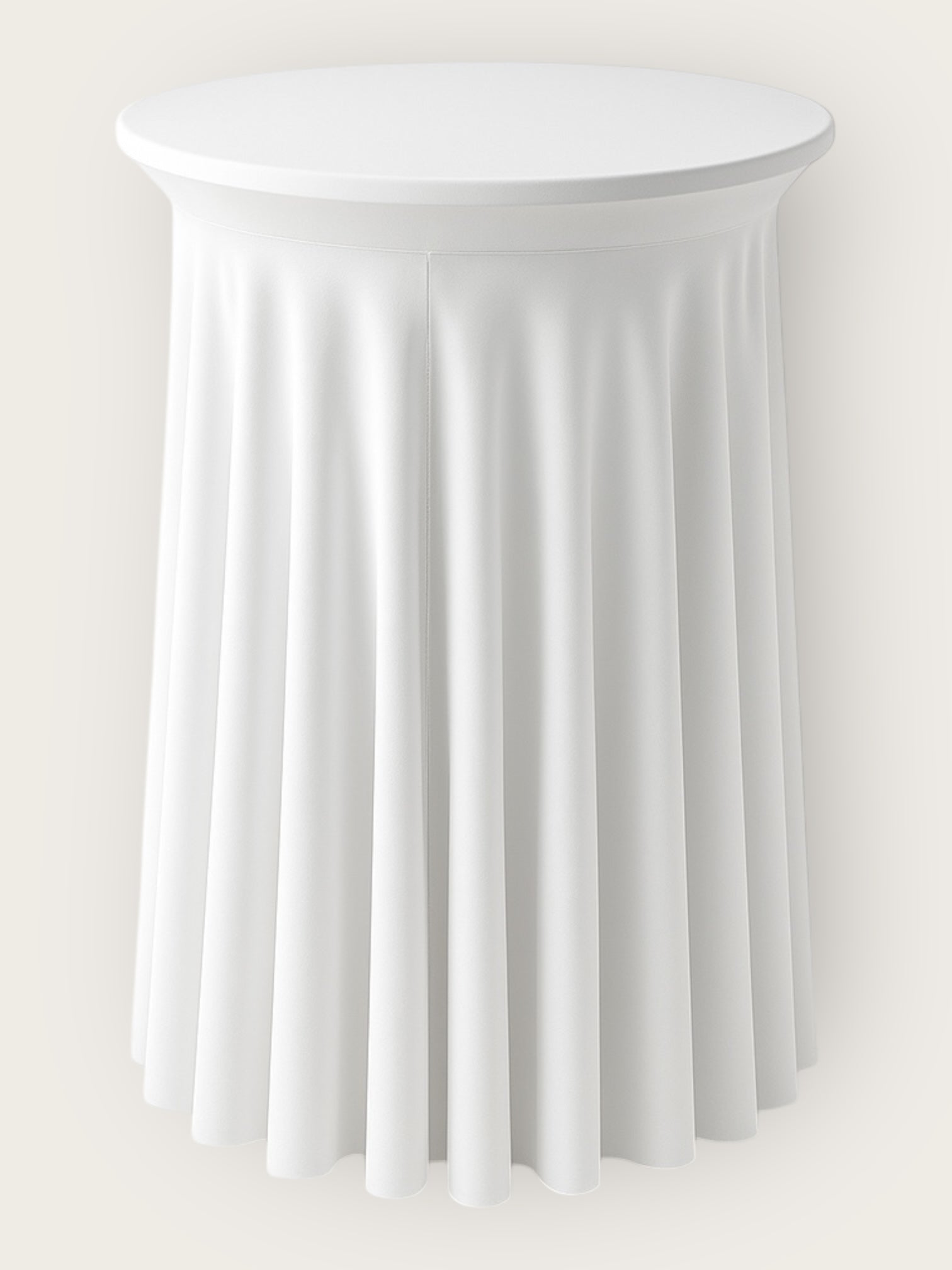 Classic bar-height table with white table cover, perfect for casual setups or standing guests. Seats 3-4 bar stools.